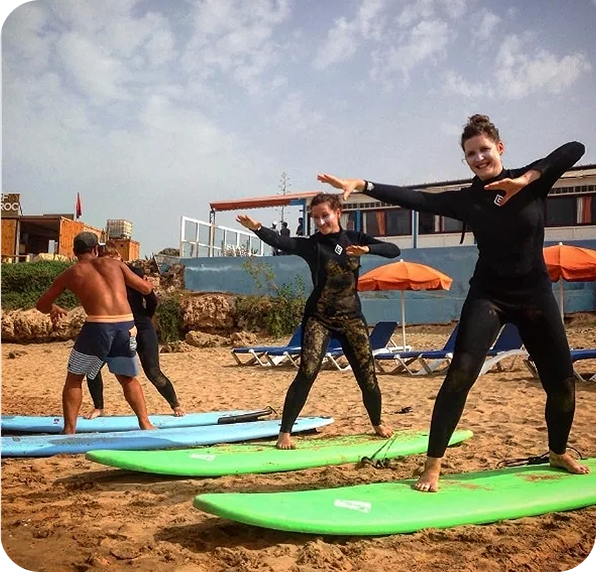 Que cela soit au surf camp Taghazout, au surf camp Agadir ou au surf camp Tamraght, c’est la formule idéale pour découvrir et s’initier, seul, en couple ou entre amis au surf Maroc. Cette activité aux multiples avantages pour le corps et particulièrement reposant pour l’esprit, développe la force, la flexibilité, l’équilibre et excellent pour le cardio. Avec ce Pack, vous vous offrez un suivi pédagogique adapté et un accompagnement pendant et après les sessions de cours.