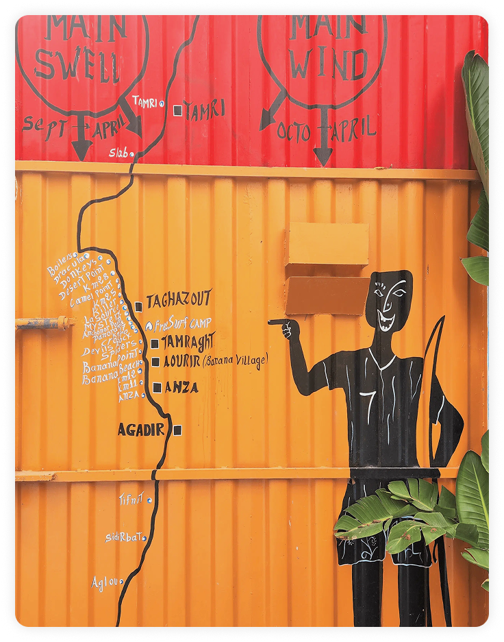 Located to the south of Taghazout, this spot in front of a small cliff is known for its big right-hand side, much appreciated by longboarders. With a few rocks, the spot is safe with a nice sandy bottom. Bananas are grown nearby, hence the spot's name!